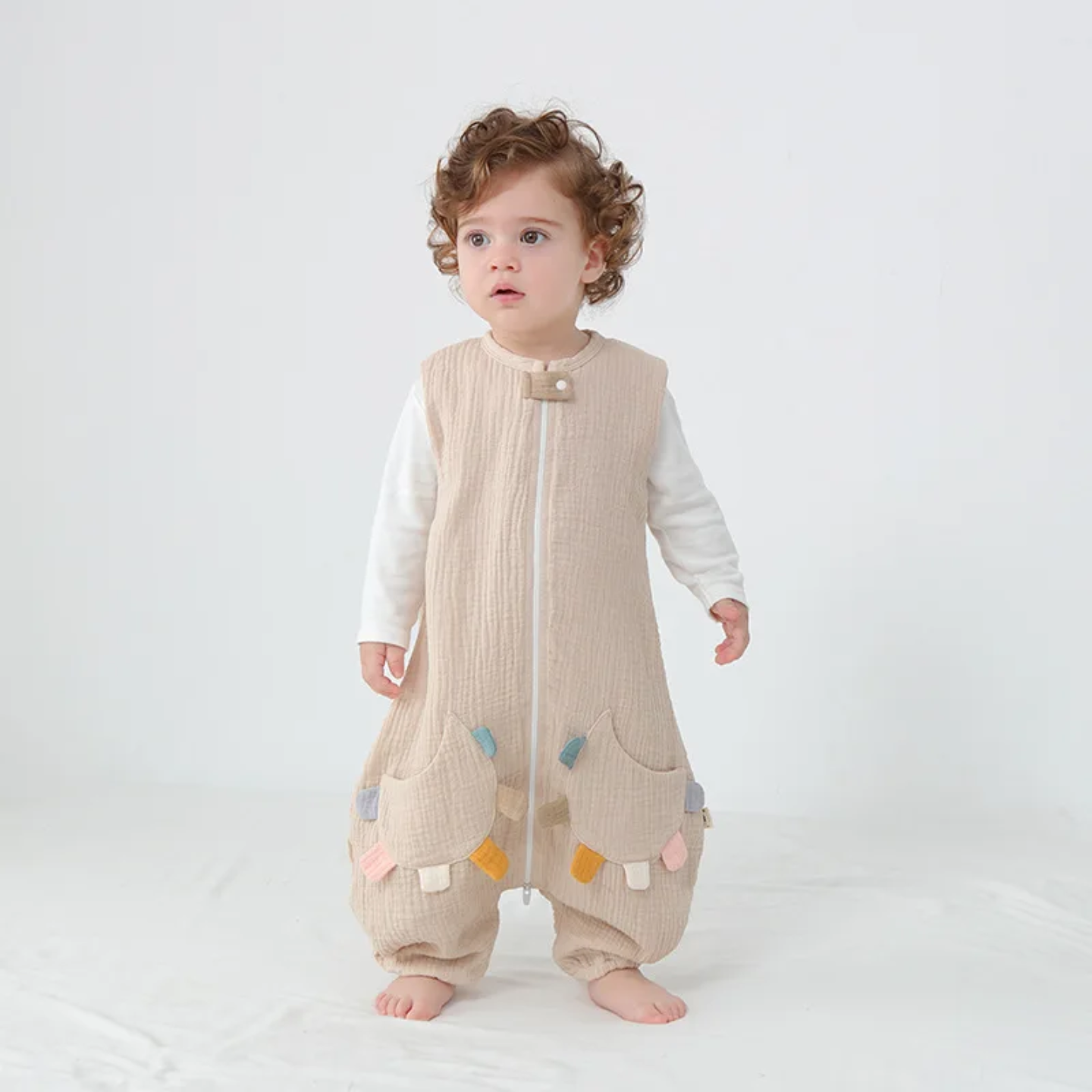 Zasnova z nogicami prinaša dodatno svobodo gibanja – malček se lahko premika, stoji ali hodi, ne da bi ga spalna vreča pri tem omejevala. To je še posebej priročno za radovedne otroke, ki se radi premikajo tudi tik pred spanjem ali zjutraj po prebujanju.